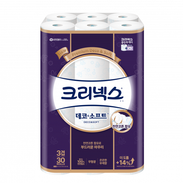 크리넥스 데코앤소프트 천연펄프 3겹 고급롤화장지, 27m, 30개입, 1개 기능성이 돋보이는 제품 특성 이 화장지는 27m의 넉넉한 길이와 30개입의 대용량으로 여러 번 사용하는 데에 부담이 없습니다...
