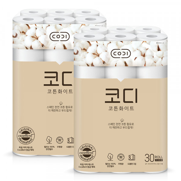 코디 코튼화이트 3겹 롤화장지 30m, 30롤, 2개[24,900원]