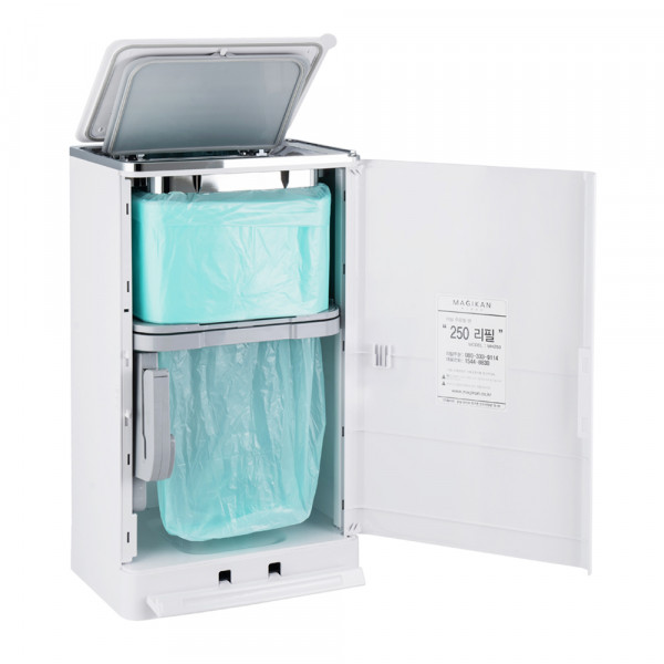 명칭은 "매직캔 오토실링 hippo II 듀얼 오픈시스템 크롬 화이트 21L MH250WCRA 휴지통 쓰레기통"!! 매직캔... 더블락 시스템, 히포 원터치 오픈의 매직캔 히포. 페달을 밟으면 속 뚜껑. 겉뚜껑 두 개의 커버가 한 번에...