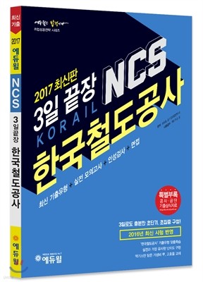 [도서] 2017 에듀윌 NCS 한국철도공사 3일끝장 : 코레일, KORAIL, NCS 2016년 한국철도공사 최신 필기시험 최신기출유형 완벽 반영, 최신기출유형+실전모의고사+인성검사+면접(특별부록: 공사·공단 기출상식자료, 2017 최신판) (14,400원) ▶ 해당 상품 바로 가기 ◀